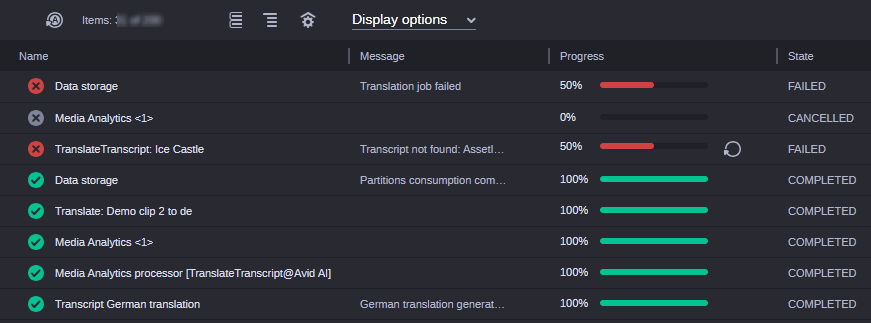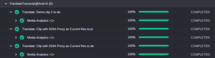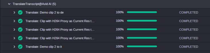 Each top-level Translate job shows the name of the asset for which the transcript translation is currently being created and a prefix (such as Translate or Avid AI Translation) in its name.