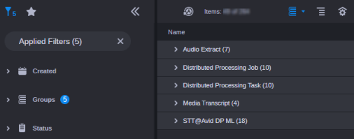 All filters are cumulative. The best approach to display Transcribe and Translate jobs in the Process app is to use the Groups filter and Show Hierarchy toggle, as described in the following procedure.