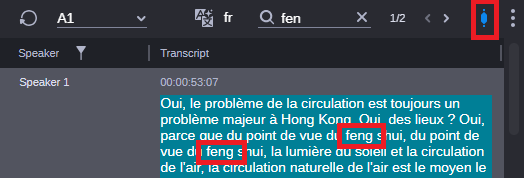 • Search is only applied to the text in the Transcript column. To filter the translation by speakers, use the Speaker filter. The procedure on how to filter speakers is the same in Transcript and Translation mode. See Filtering Speakers.