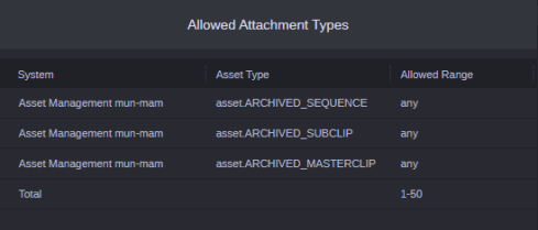 The Allowed Attachment Types window provides detailed information on the number and type of allowed assets. Each row represents a rule.