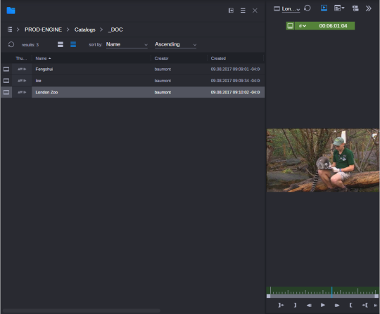 (Option) If you want to locate your content or source video from the Browse app before you open the Publisher app, you can open the Browse app first in Cloud UX, and then locate and load a clip into the Video player in the Cloud UX user interface as shown below: