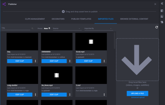If you click the Publisher app icon without first selecting a clip from the Browse app, the Publisher app will open to the Imported Clips tab (one of five tabs below the Publisher app header).