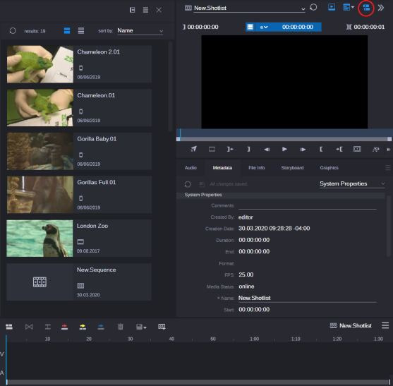 Your sequence is created in the folder as “New.Shotlist.” Locate the sequence in the Browse app, and double-click it to load it. It’s empty, but it opens in the Media Viewer, with a start timecode displayed. There’s metadata in the Metadata tab, and two tracks in the Sequence Timeline: V (Video) and A (Audio). If you don’t see the Sequence Timeline at the bottom of your screen, click the Timeline button in the top-right corner of the Asset Editor to display it.