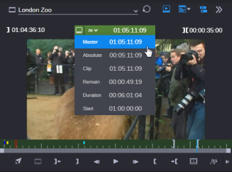 You can drag the blue position indicator to scrub through the clip, or use controls to play forward and back, until you have decided on your In and Out marks. In this example, In and Out marks are set for a duration of 35 seconds, as shown by the In to Out Duration in the upper right. Note how the timecode setting is set for Master (m), which represents the timecode for the position indicator. Click the turn down arrow to change the timecode setting.