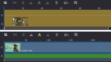 To add the edited clip to your sequence, click the image in the monitor and drag it to the Sequence Timeline, so that the pointer is below the thin guideline and the outline of the clip is yellow (which indicates an insert edit). Then release the mouse button. Your new sequence now has its first clip.