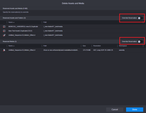 You can also remove reservations on assets manually before performing the deletion process. For more information about setting reservations, please visit the topic Setting Reservations (Avid Production Management).