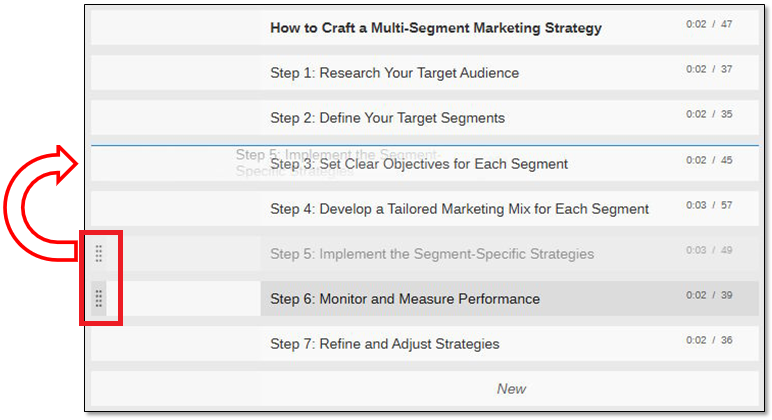 During reordering, the "dragged" segment is visible, as shown by "Step 5" in the above example, and the new position is indicated with a blue line.