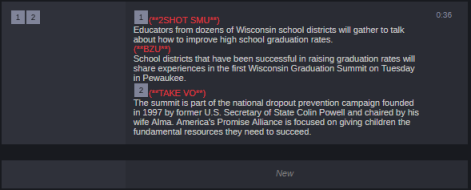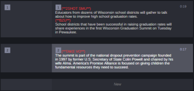 You can use segments to time the text and integrate it with video, audio, graphics, and production cues. See Adding Media to a Story. Multiple timed segments are combined to form the overall story. The following illustration shows the same story as the one in the previous example, but written split into two segments.