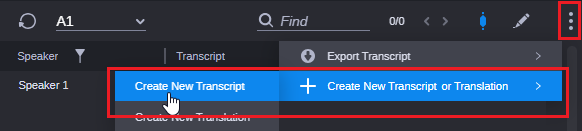 If the button is not shown, click the More Options button and select Create New Transcript or Translation > Create New Transcript from the menu.