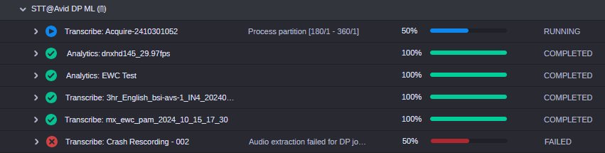Click the Expand button to the left side of the STT@Avid DP ML group header to show all top-level Transcribe jobs.