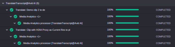 Each top-level Translate job shows the name of the asset for which the transcript translation is currently being created and a prefix (such as Translate or Avid AI Translation) in its name.