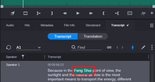 • When two words share the same timecode, both words are highlighted in green in the Transcript tab.