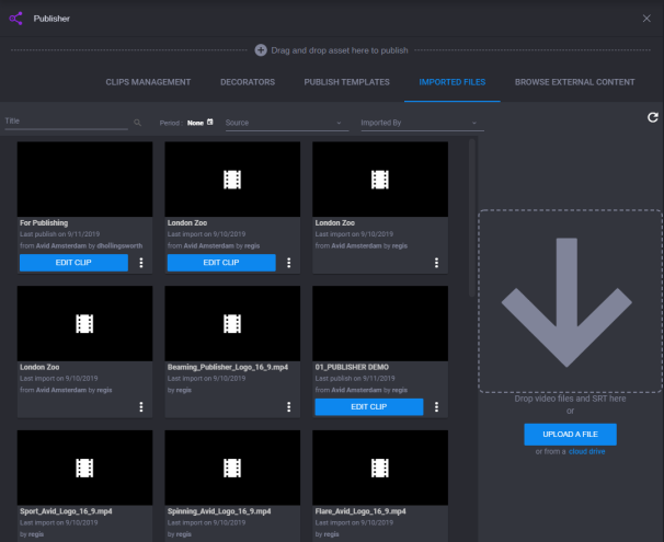 Once accessed, the Publisher app opens to an initial interface with five tabs appearing below the Publisher app header (Clips Management, Decorators, Publish Templates, Imported Files, and Browse External Content) as shown in the following screen example: