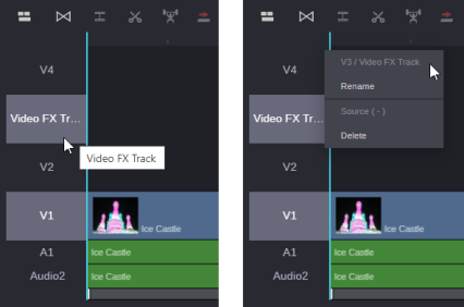 Sequences allow you to assign custom naming to both audio and video tracks. As shown in the following illustration, A2 has been renamed as “Audio2” and V3 has been renamed as “Video FX Track”.