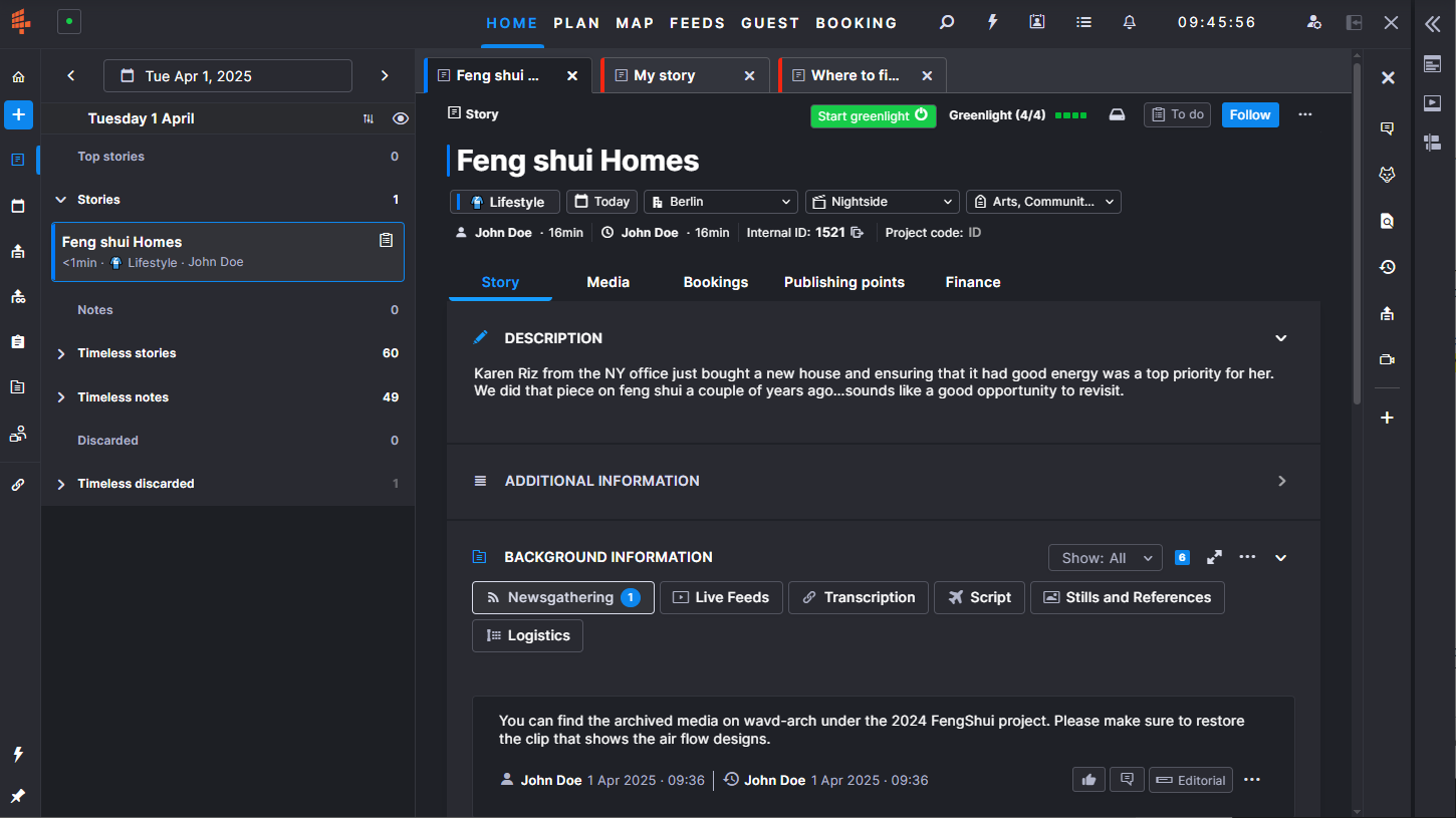 Story — You might consider a story to be the top-level concept around which your story-centric workflow is designed. From here you can add bookings (resources) or media assets, track the Greenlight status, add publishing output (such as a social media outlet or a Newsroom Management rundowns), and more. Alternatively, you could create an event that links multiple stories together to form a larger concept.